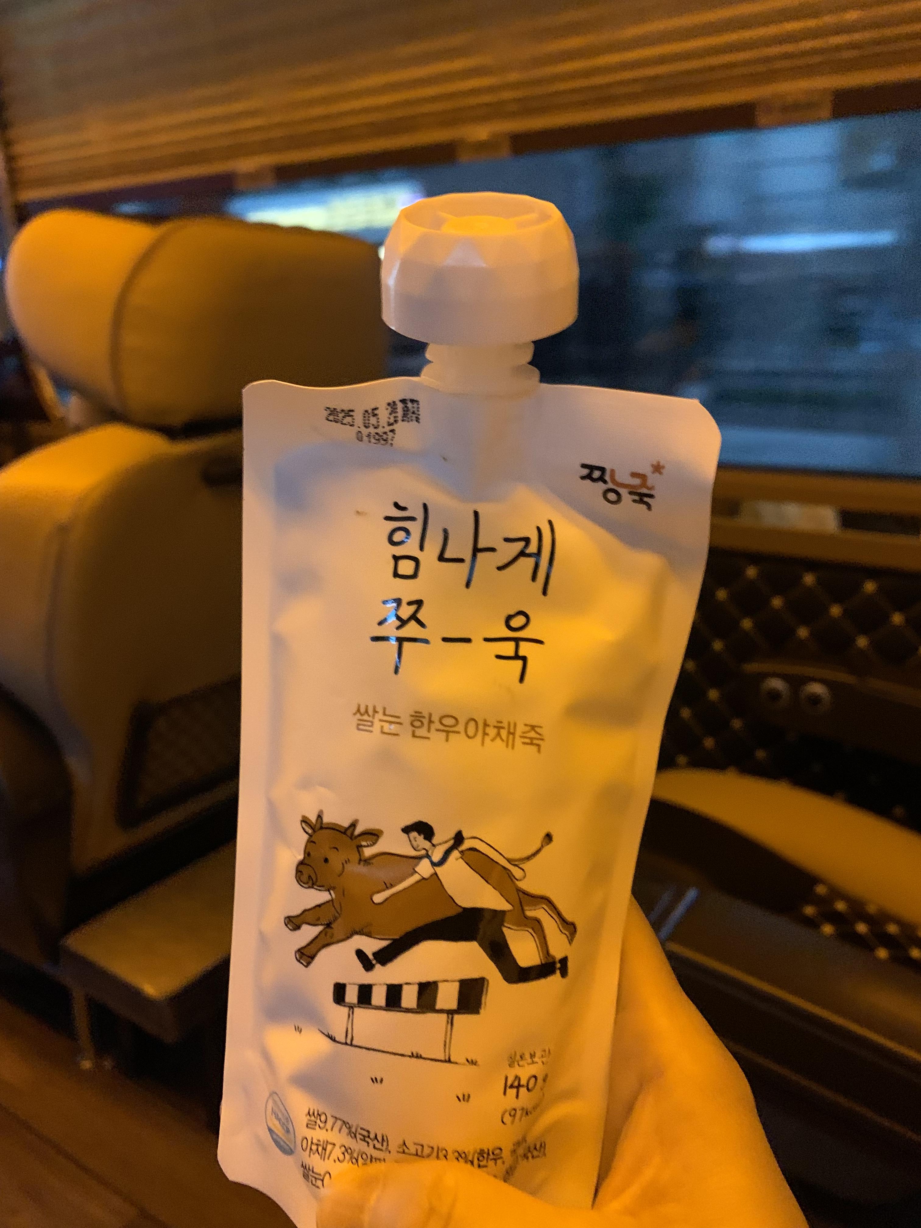 동행인과 각각 조식으로 김밥과 파우치 죽을 먹으면서