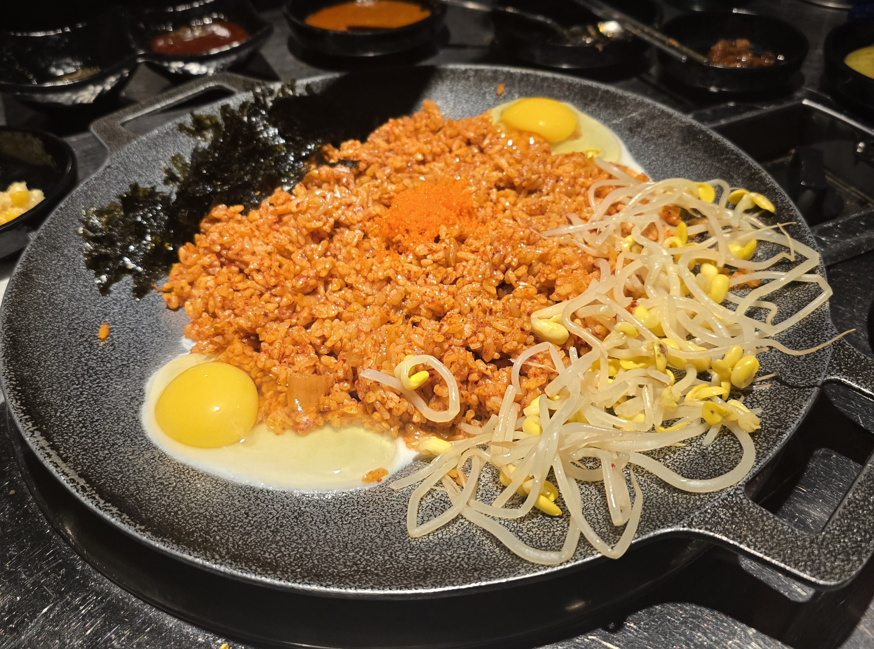 볶음밥은 새로운 팬에 준비해서 계란과 콩나물, 김가루와 함께 담백하게 볶아주니
