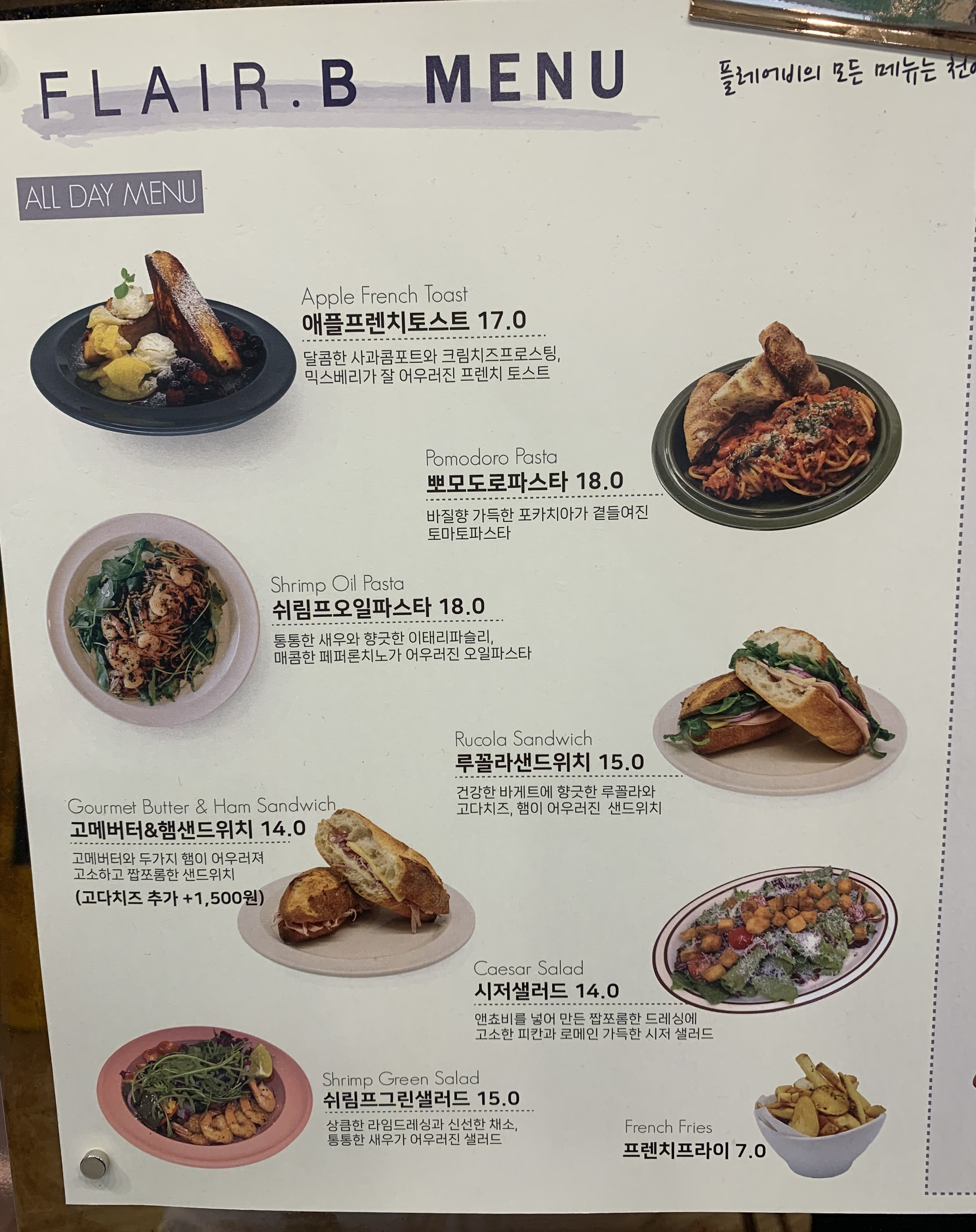 메뉴 : 9:00~15:00  로제오믈렛, 에그베네딕트, 클럽샌드위치, 토마토수프&햄치즈샌드위치  가능