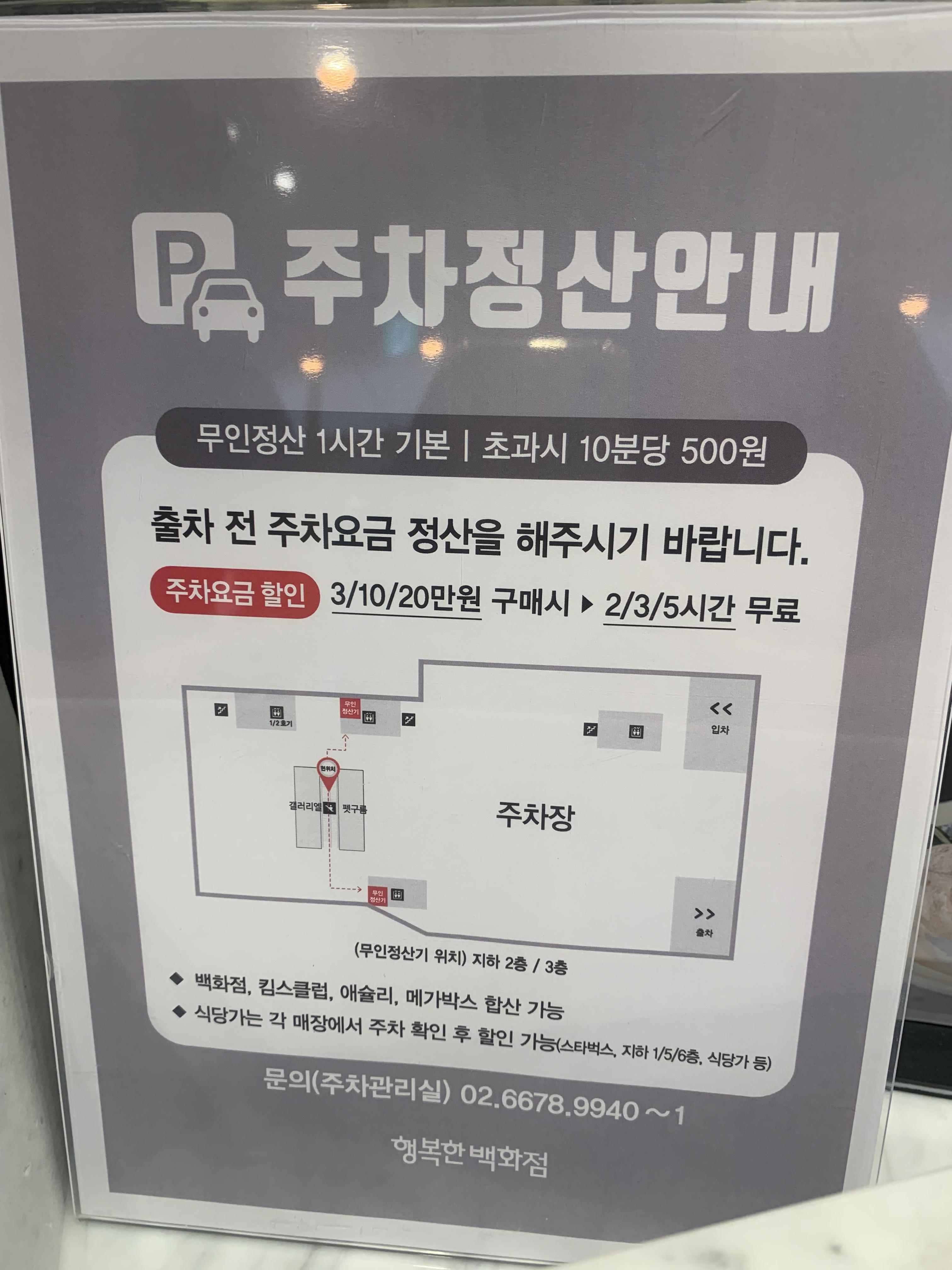 주차 : 행복한세상 지하 주차장 사용 가능 (행복한 세상 입점매장 구매 시 추가 주차 정산 가능)