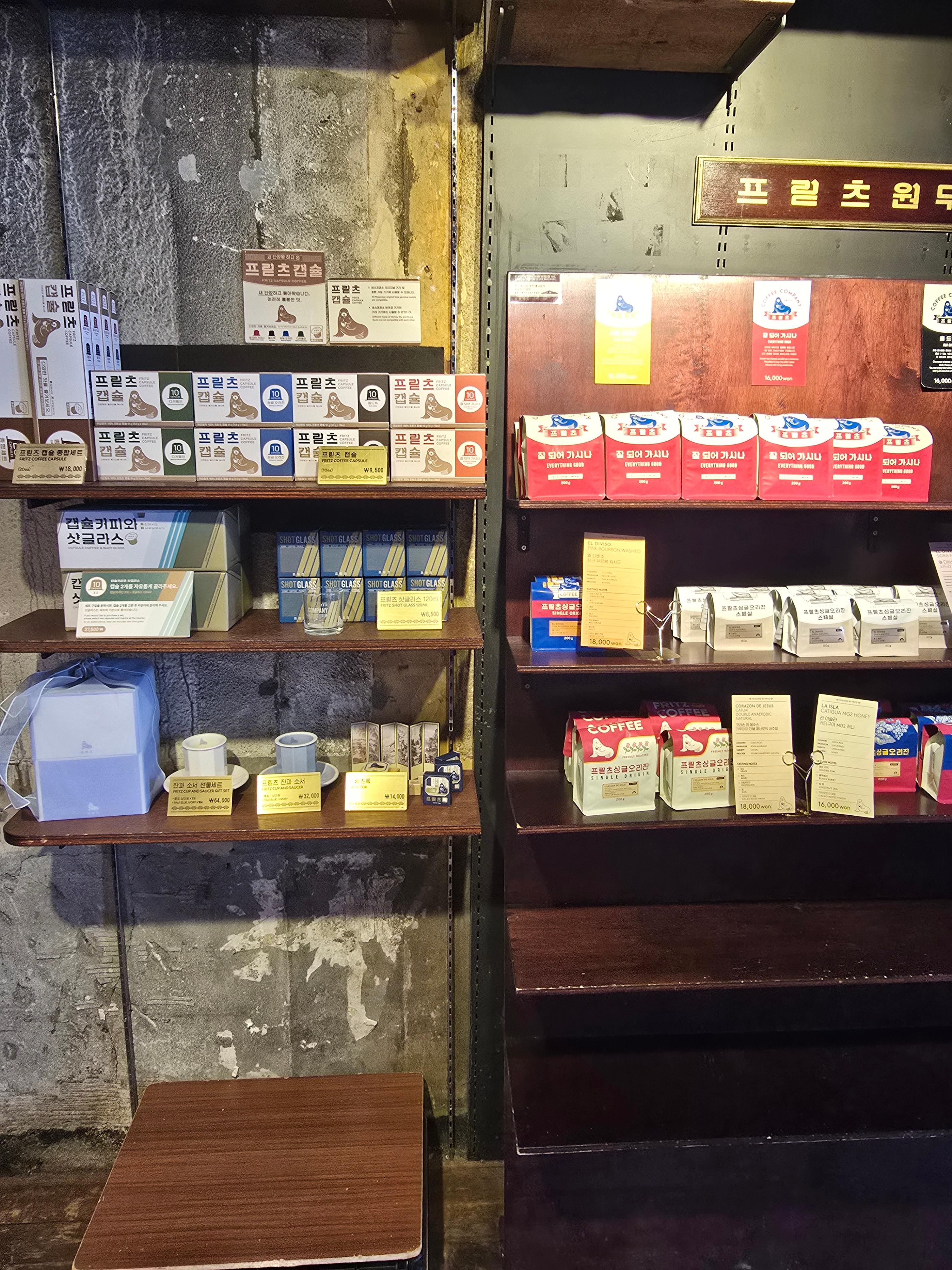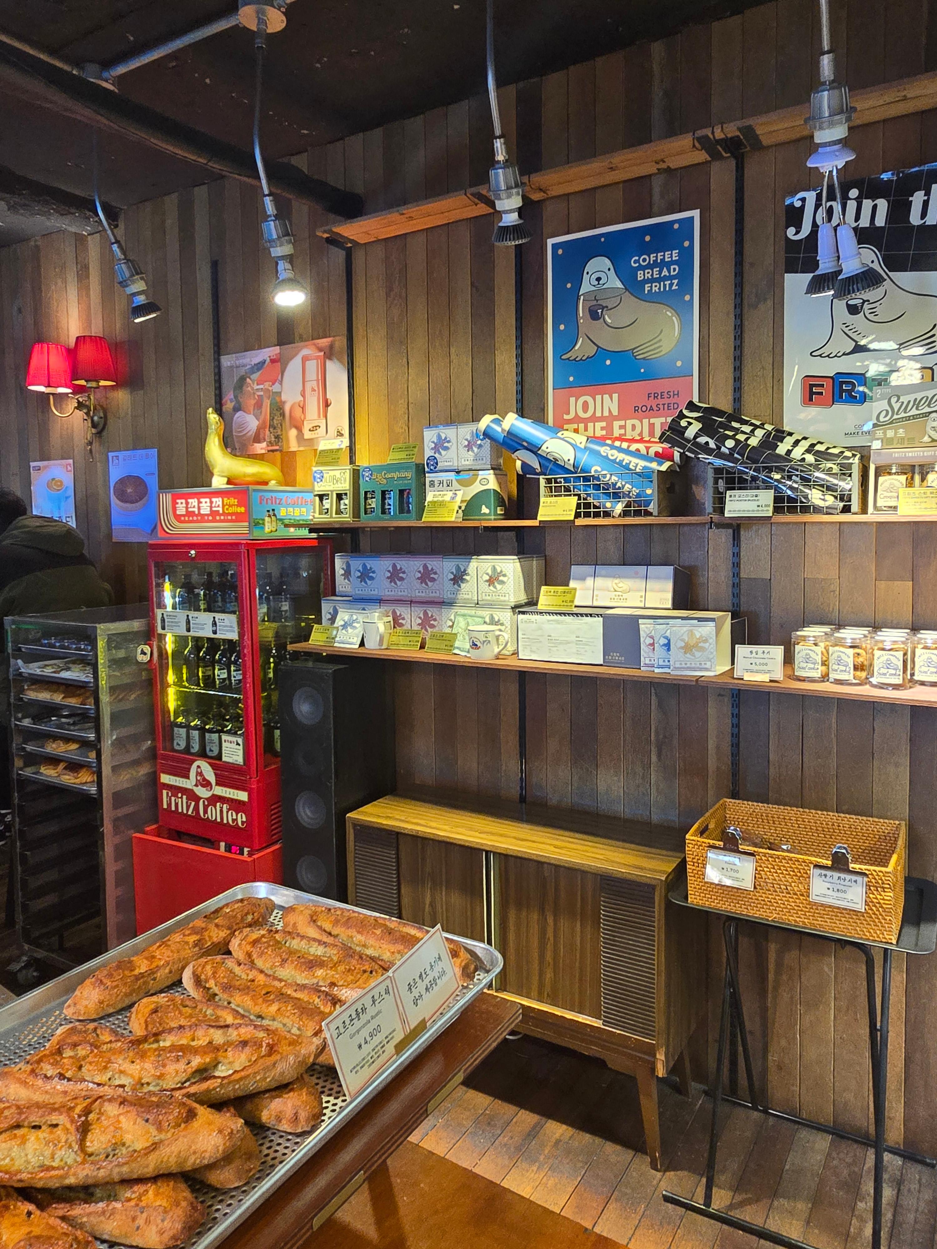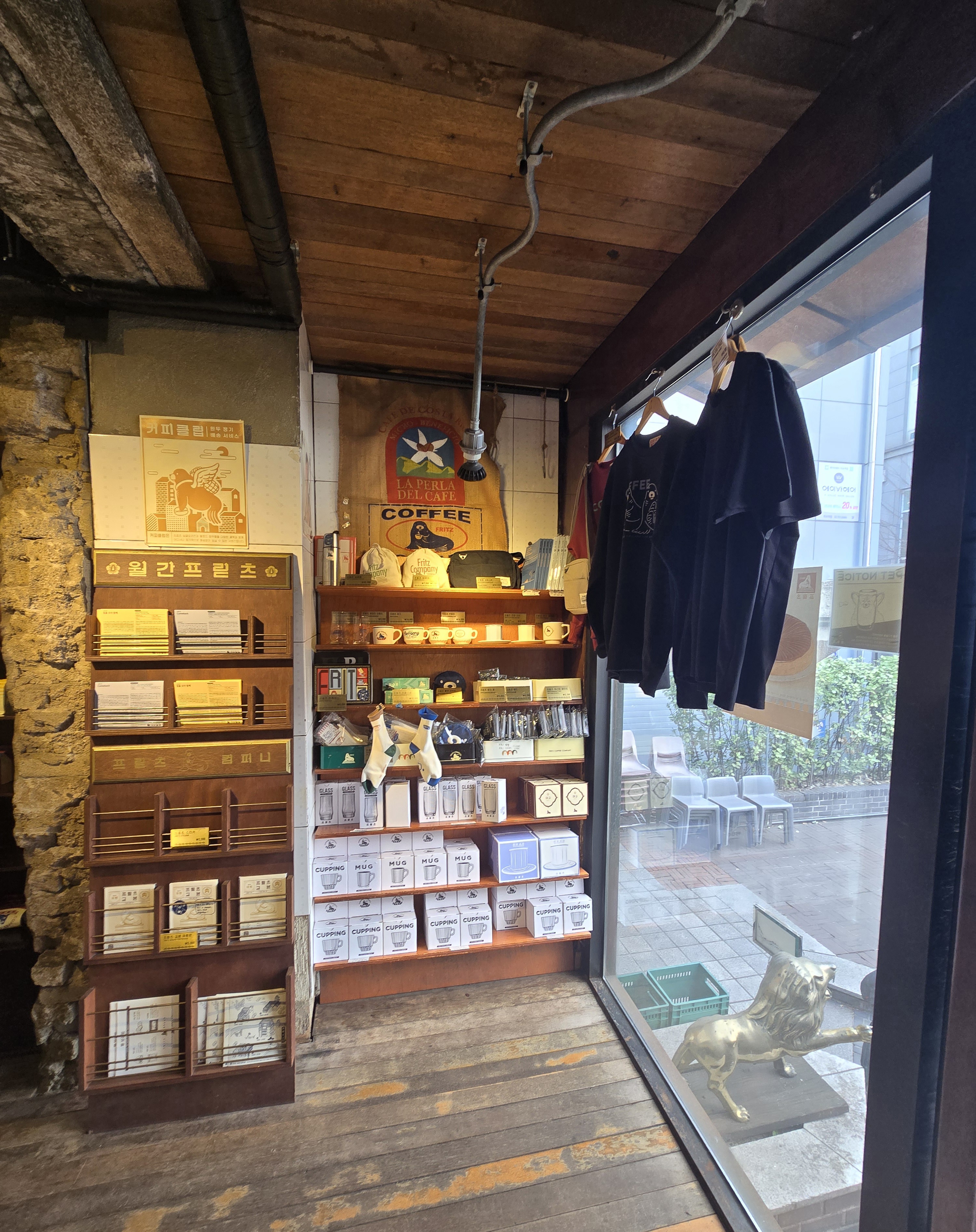 1층에서는 빵과 커피를 판매하고, 각종 굿즈와 판매 가능한 원두가 전시돼 있다.