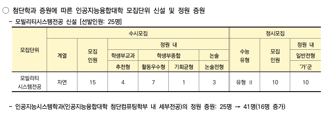 이 학과는 인공지능융합대학 소속의 모빌리티시스템전공으로 신설되었으며, 2026학년도 총 모집인원은 25명입니다.