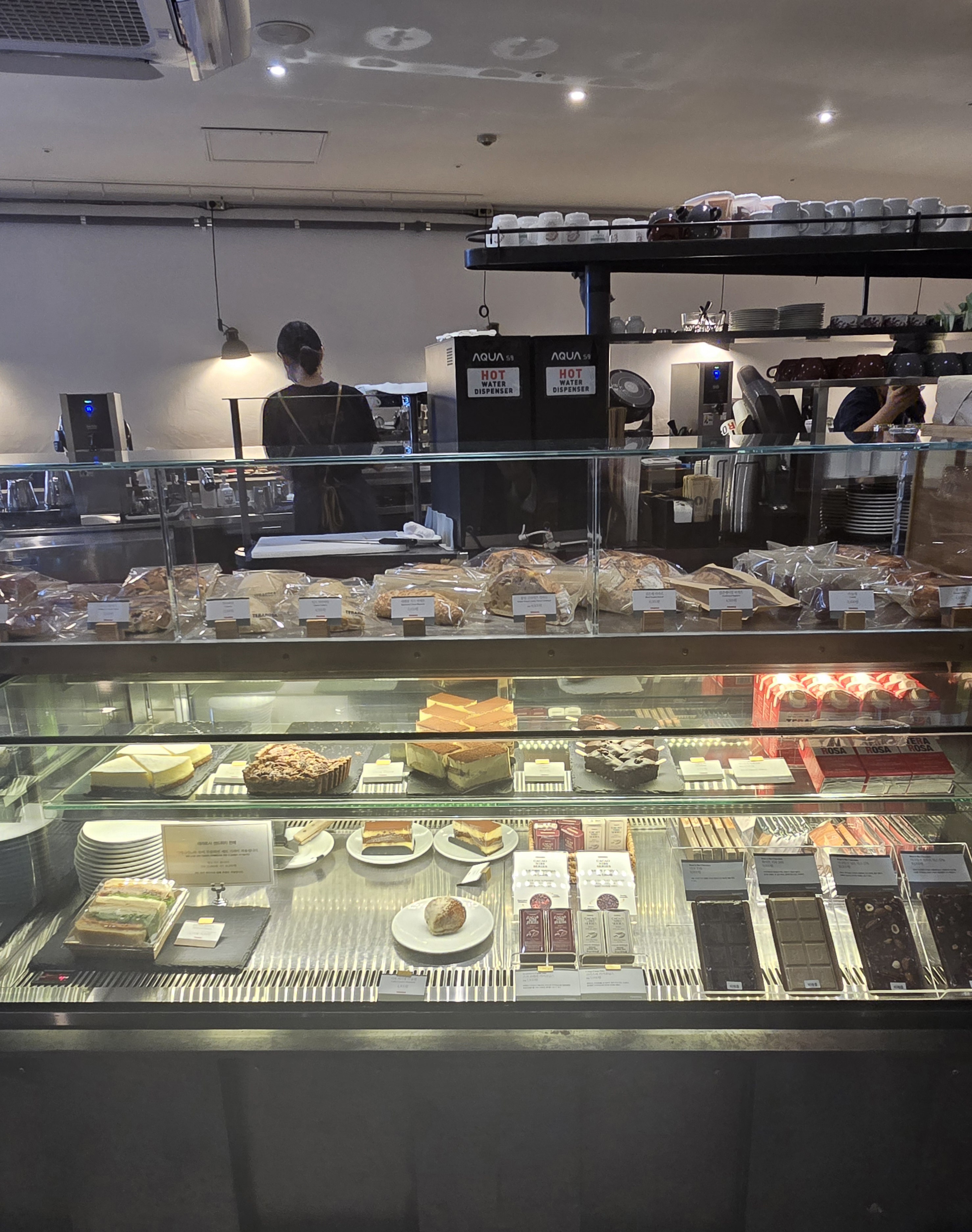 중앙에 음료제조공간과 디저트가 전시되어 있다.