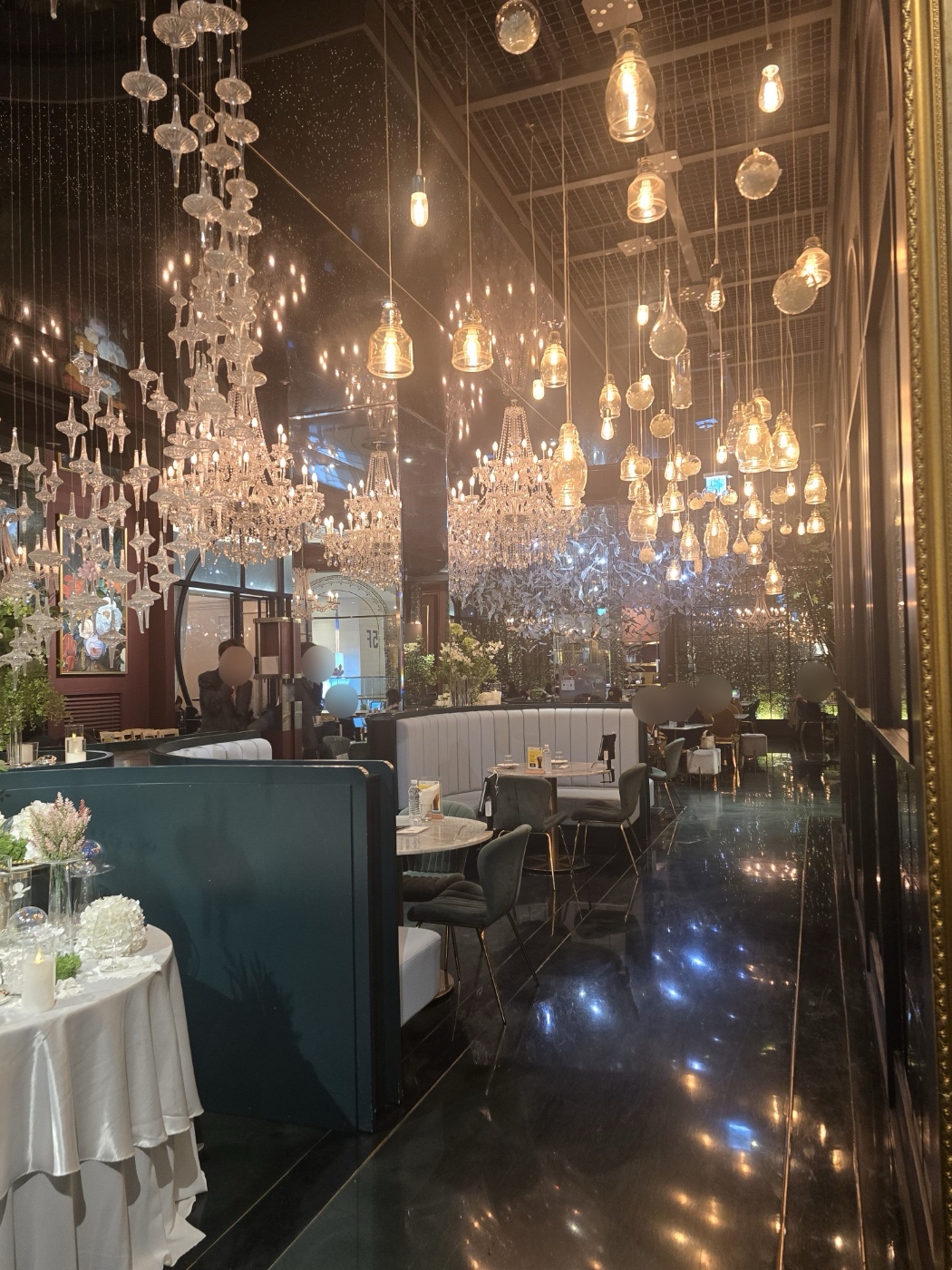 천고가 높은 매장에 수많은 샹들리에와 조형물들,