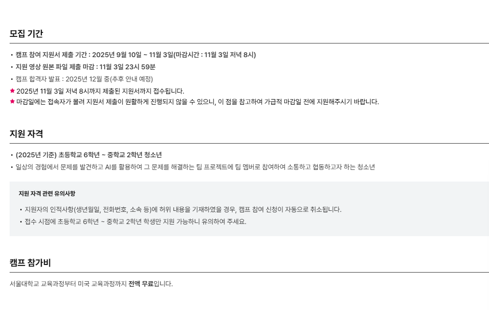| 지원 대상 학년은 어떻게 되나요? | 2025년 한국 학제 기준 초등학교 6학년 ~ 중학교 2학년입니다. |