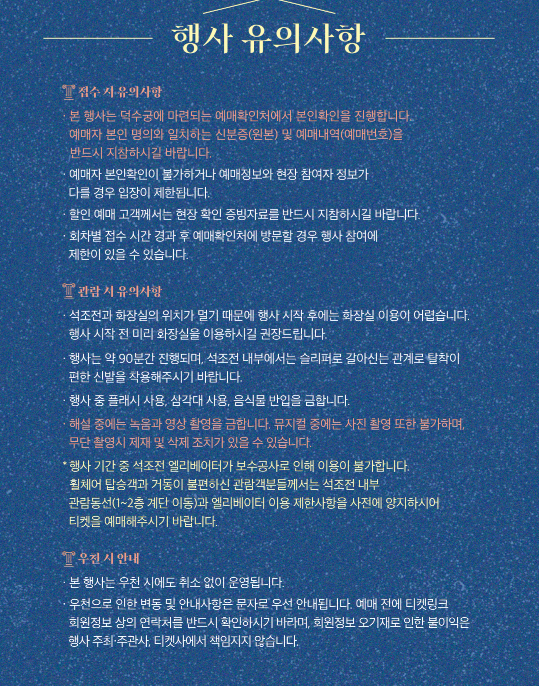 대한제국 황실의 일상을 엿보고, 그 시대의 아픔과 희망을 음악으로 느껴볼 수 있는 귀한 시간이 될 것입니다.