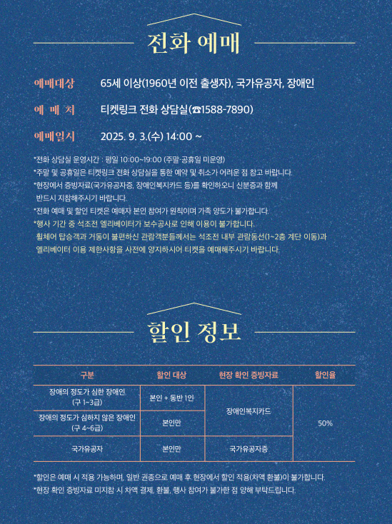 전화 예매(티켓링크 전화 상담실 ☎ 1588-7890)도 마련되어 있으니 참고하시기 바랍니다.