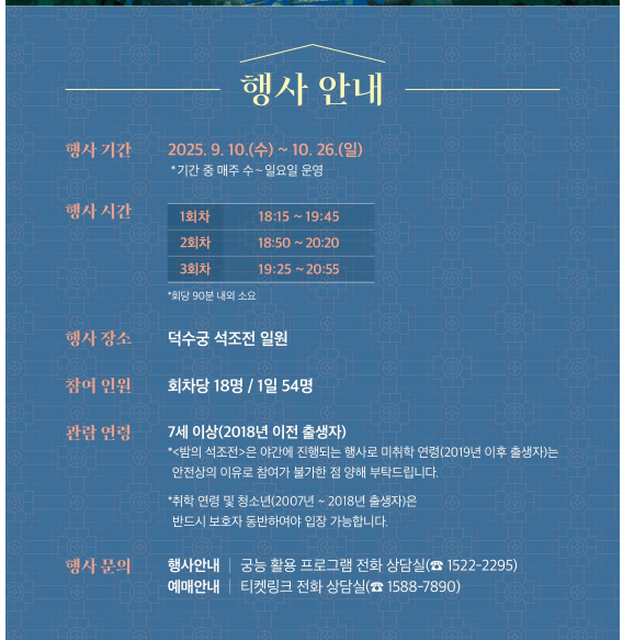 접수 시간은 각 회차 시작 20분 전부터이며, 덕수궁 대한문 앞 '덕수궁 밤의 석조전' 예매확인처에서 진행됩니다.