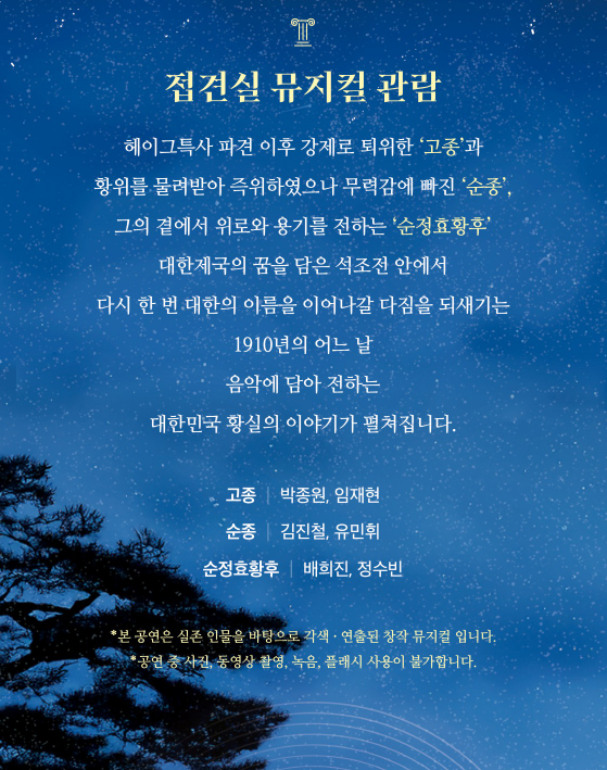 석조전의 접견실에서 창작 뮤지컬 '접견실 뮤지컬 관람'이 펼쳐집니다. 헤이그 특사 파견 이후 강제로 퇴위당한 고종과 그의 아픔을 이어받은 순종, 그리고 그 곁을 지킨 순정효황후의 이야기를 음악으로 풀어낸 작품입니다. 1910년의 어느 날, 대한제국의 꿈을 다시 한번 되새기는 감동적인 스토리를 만나볼 수 있습니다.