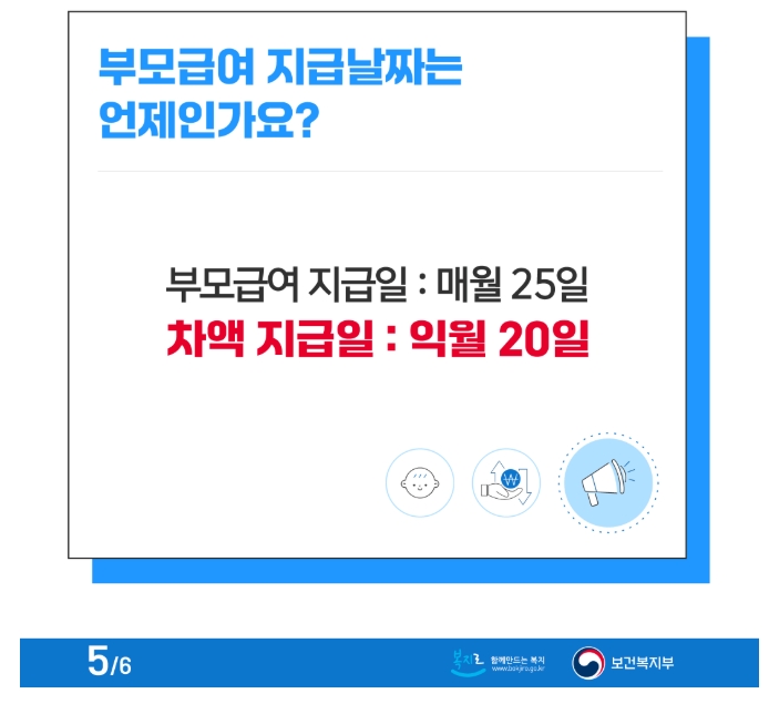 - 부모급여 차액 지급일: 익월(다음 달) 20일