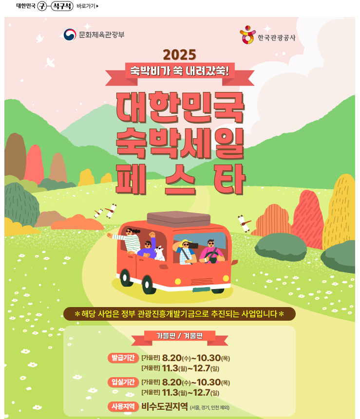 2025 대한민국 숙박세일 페스타는 문화체육관광부와 한국관광공사가 주관하는 공식 행사입니다. 아래의 링크를 통해 더 자세하고 공신력 있는 정보를 얻을 수 있습니다.
